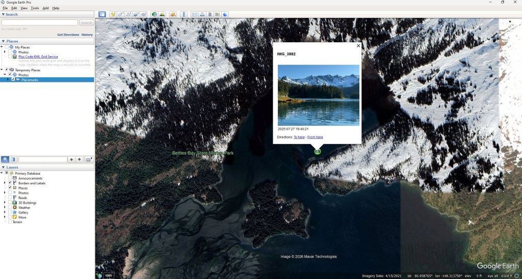 PixaGEO requires that KML files be associated with Google Earth Pro. This typically occurs during Google Earth Pro on desktop installation. Unfortunately, Google Earth Pro does not recognize a photo’s Exif orientation value, so vertical JPEG image thumbnails will not appear upright.